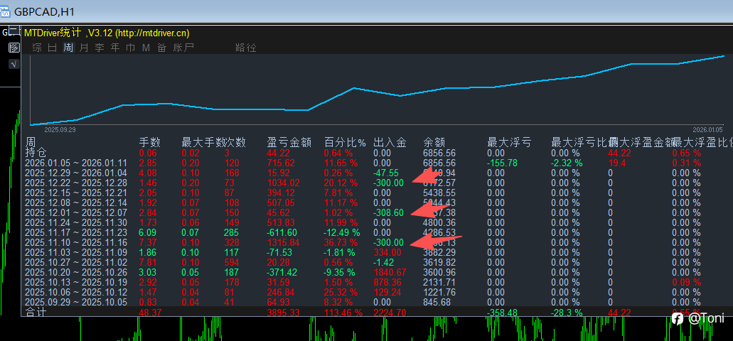 这不是一个追求高收益的账户。 它存在的目的很简单: 每个月,稳定出金,解决一个正在读大学的孩子的生活费。 一、为什么要做这样一个账户 2025 年 10 月,我为这个账户入金 3000 美金。 在入金之前,就先设定了几个前提: 不追求排名不做翻倍目标不靠一次行情证明自己这个账户,必须长期活着 因为它不是一个“展示账户”, 而是一个会被真实生活不断打断、不断消耗的账户。 二、账户的运行规则(这是最重要的部分) 这个账户从一开始,就有一条刚性规则: 出金优先级,高于收益展示。 具体规则很简单: 出金用途:孩子大学阶段的生活费出金频率:每月一次出金是否执行:不以当月盈亏为依据,而是按生活节奏发生 也