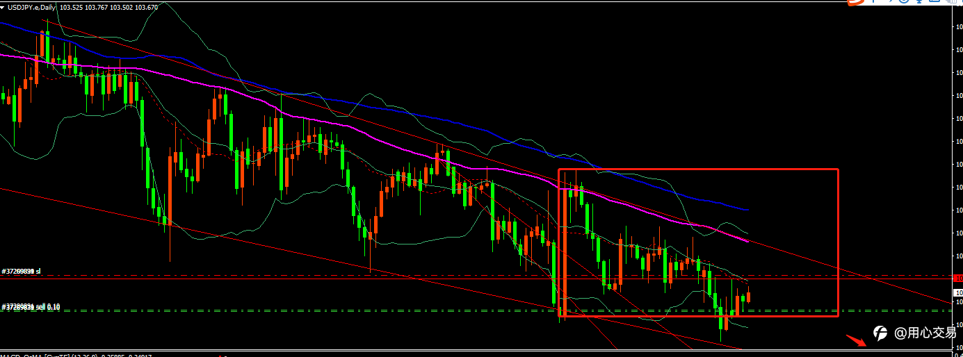 首先美日是看空 先说美日,日周均线都向下,是空头趋势,日线上103.9到104是中轨压制,我用的是KVB交易平台12月16号日线最高点是103.919,12月21号最高点是103.890。我统一设置的止损是103.95.如果止损,上方看104.5到105之间压力。如果没止损,就继续拿到破新低。 上一个平台区间是104.7到103.7,突破后价格跌到了102.87附近,大约为上一个平台一倍价格。 再前方的一个大平台是105.6到103.3,那下一个低点位置可能是103.3-(106.6-103.3是2.3)大约是101的位置。如果到了这个位置,那很大可能市场是要破掉100的位置,短中期就以美日空
