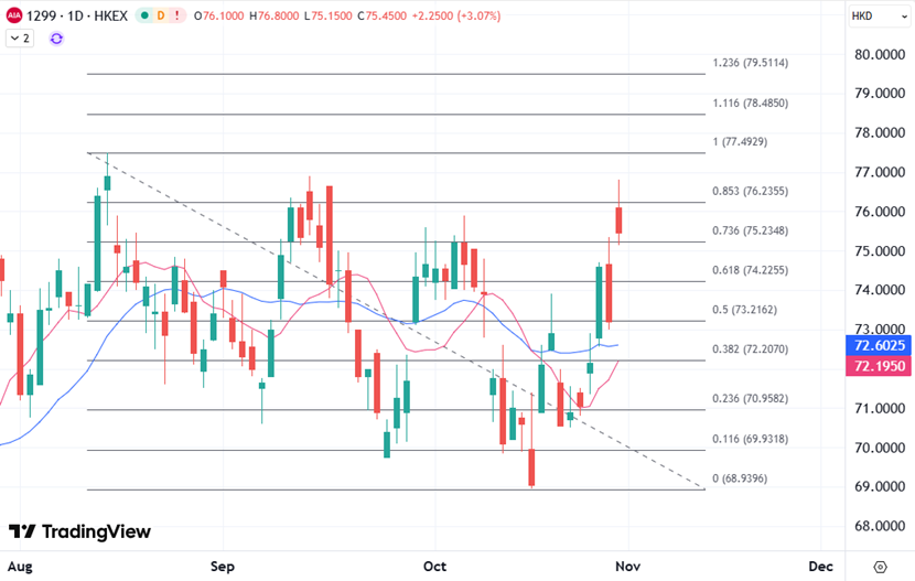 ATFX港股:友邦保险(01299)公布最新业绩,新业务价值创第三季新高,新业务价值利润率增加5.7个百分点至58.2%,今早股价跟随利好高开近4%后涨幅扩大。 友邦保险(01299)公布,于截至9月底止首3季,新业务价值43.14亿元(美元.下同),按固定汇率计算,按年上升18%;年化新保费按年升10%至74.92亿元;新业务价值利润率为57.9%,升4.2个百分点。按实质汇率计算,新业务价值升19%,年化新保费升11%,新业务价值利润率升4.6个百分点。 第三季度新业务价值14.76亿元,创第三季新高,按固定及实质汇率计按年分别升25%及27%,当中本港、内地、东盟,以及印度等11个市场录