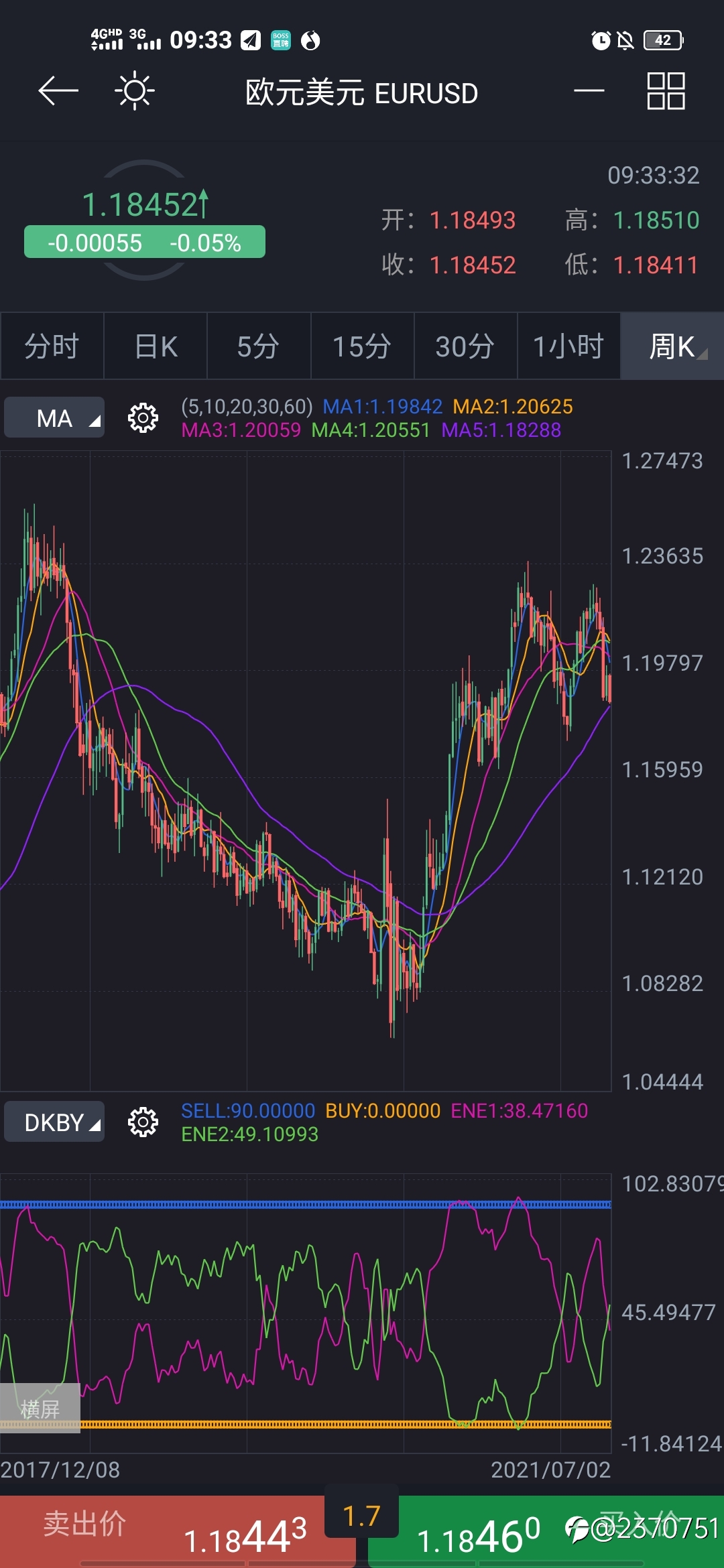 从欧元周线图来看 欧元经过一年多的上涨已经接近尾声 现在是处于震荡中 并且震荡也将结束 可低多高空