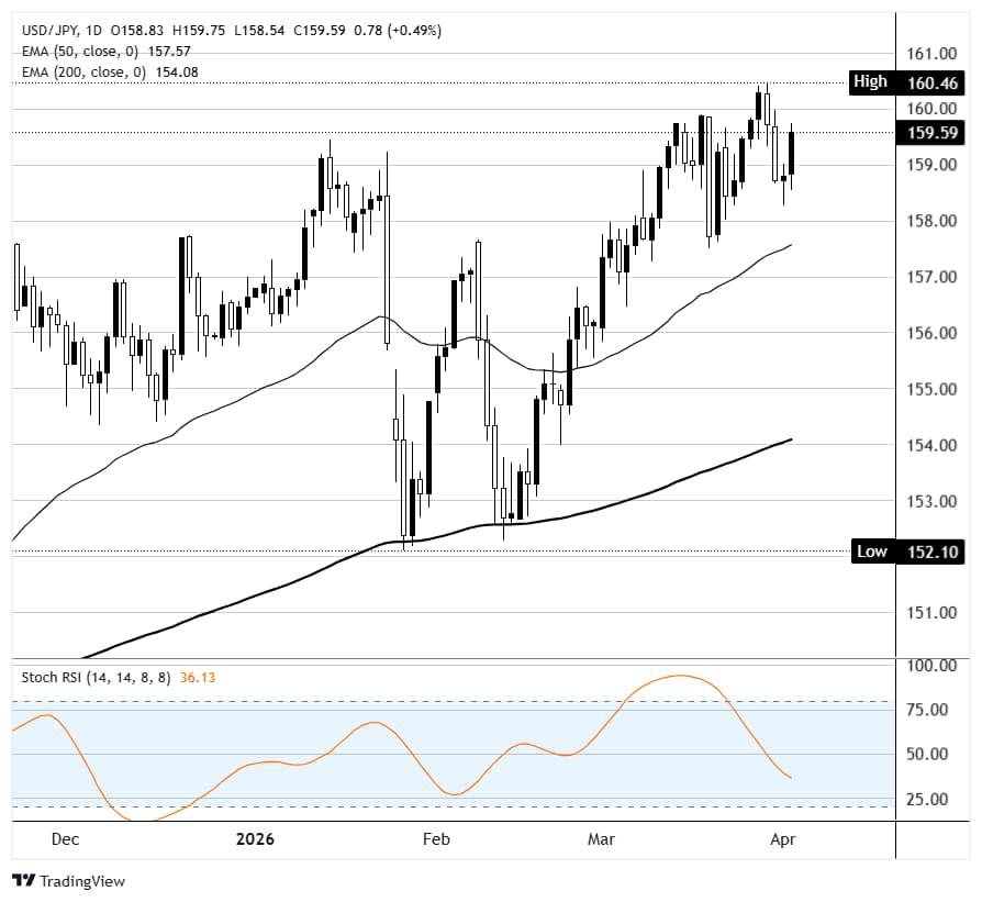 USD/JPY đã tăng lên gần 159,60 vào thứ Năm khi đồng Đô la Mỹ mạnh lên nhờ giá Dầu tăng vọt và kỳ vọng cắt giảm lãi suất của Fed giảm dần, đưa cặp tiền này vào tầm ngắm của mức quan trọng 160,00.Bộ Tài chính Nhật Bản (MOF) đã nhiều lần cảnh báo về "hành động quyết đoán" đối với các biến động hỗn loạn