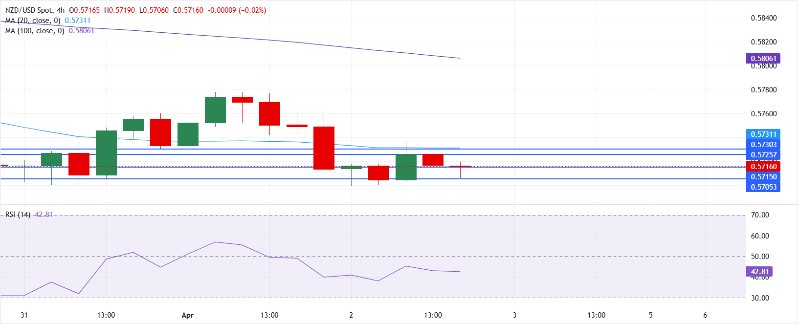 Cặp NZD/USD giảm nhẹ xuống gần 0,5710 trong phiên giao dịch châu Á ngày thứ Sáu. Chỉ số PMI Dịch vụ RatingDog của Trung Quốc giảm xuống 52,1 trong tháng 3, thấp hơn dự kiến. Dữ liệu việc làm tháng 3 của Mỹ sẽ là điểm nhấn vào thứ Sáu. Cặp NZD/USD kéo dài đà giảm xuống mức thấp gần bốn tháng quanh 0,