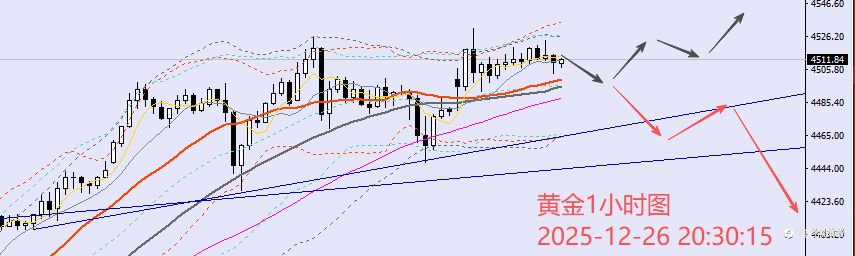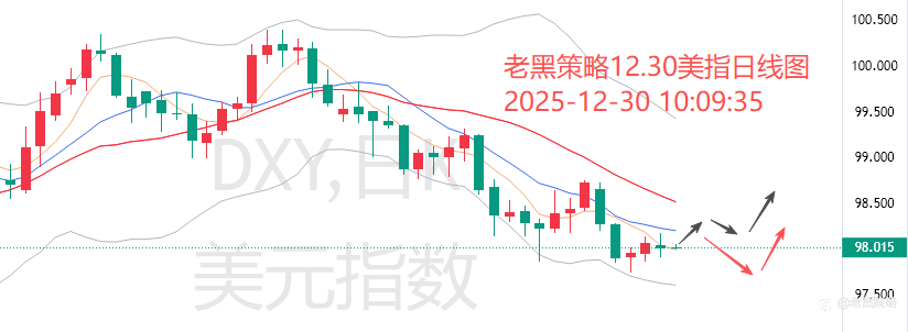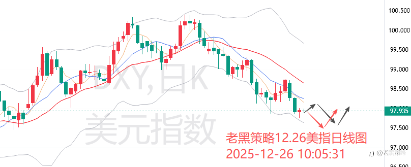 12.26外汇、黄金、原油分析策略: 【美指】 圣诞假期前美指持续低位横盘震荡,日线收得一阳星线,技术上来看,阳线或预示着下跌趋势的暂缓,但是日均线系统依然还是呈现空头排列的,这就意味着短期内美指很难有质变反转,大概率还是要延续弱势震荡节奏。今日美指上方可关注98.1-2附近压力争夺,若延续弱势下修,下方空间预期也是有限的,可以着重关注97.6/5附近争夺测试。 考虑到周末以及下周元旦假期因素依然会对市场情绪有不小的制约影响,故日内保守者暂且还是继续选择观望为宜,规避近期特殊时间节点情况下市场的不稳定情绪风险。 【黄金】 黄金周三先延续震荡走强,亚盘时段再创新高至4525,然后行情受假期因素影