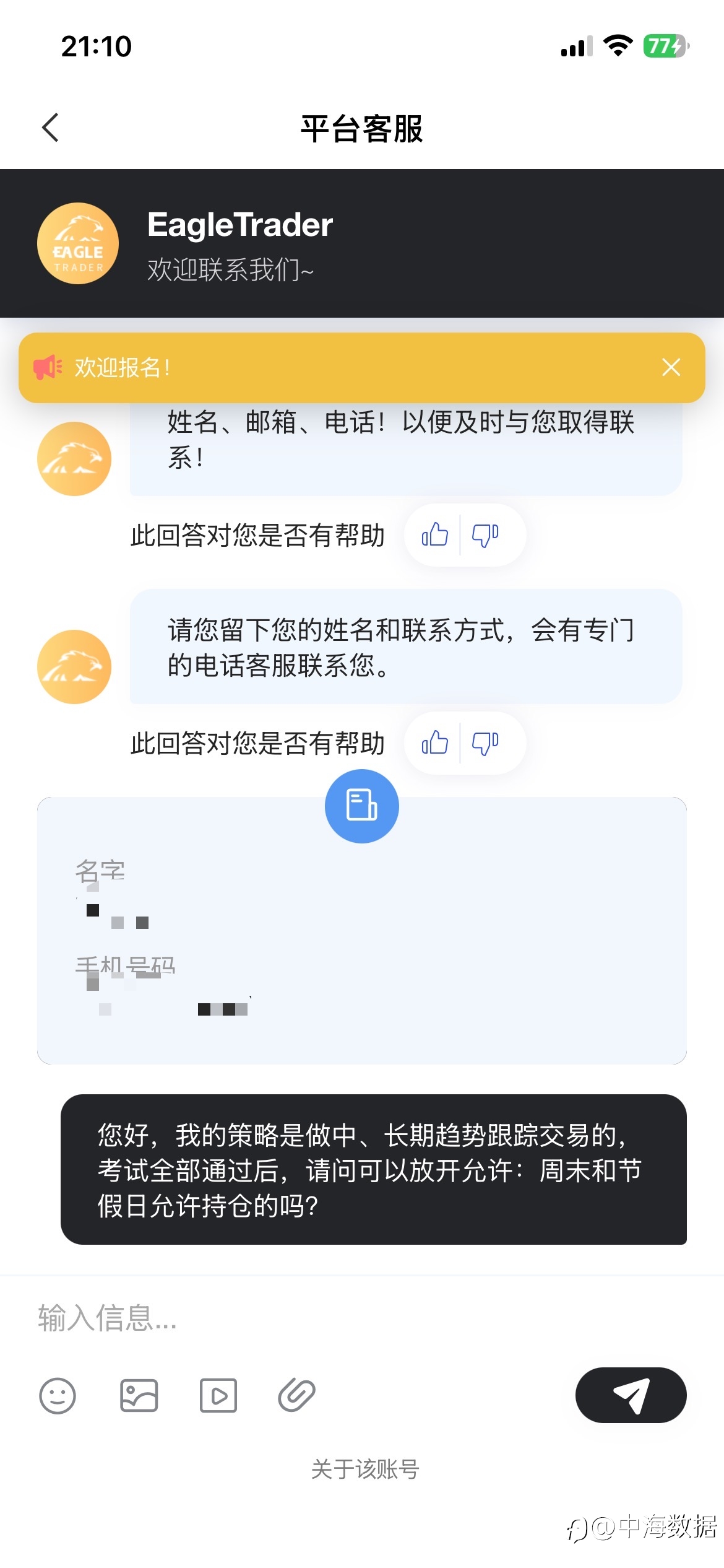 中海数据 Theo dõi 4,929 Đang theo dõi 1,055 Người theo dõi 13,820 Độ phổ biến ··· 2,403 Lượt xem 30 Jan 2021 Tham gia China 趋势跟踪交易,手工下单!50倍杠杆以上请3000美金跟随一个品种固定0.01手。50倍杠杆以下请10000美金跟随一个品种固定0.01手;记得不要干预策略,特别是看到浮盈多的时候不要手动平仓。让策略去执行!
