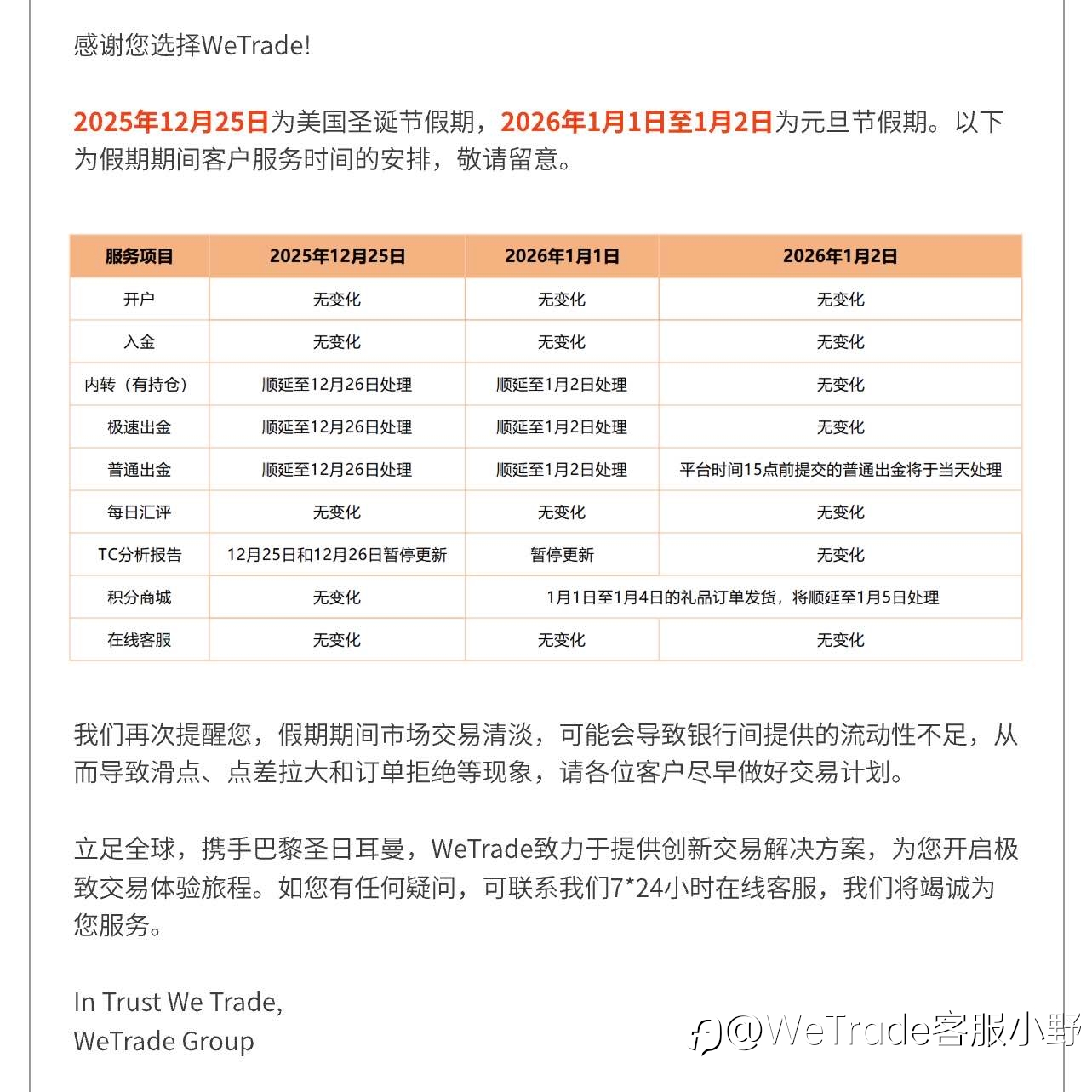 WeTrade敬请您留意双旦交易产品和客服时间变化