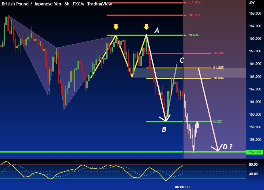 The GBP/JPY after our previous Take profit made from the confluence of the Bearish Harmonic pattern and the Double TOP , now we can see that the price had a solid direction of the trend , Bearish . Now, The price after retest again the 163.000 area in confluence with 61.8% Fibo, so there is a High %