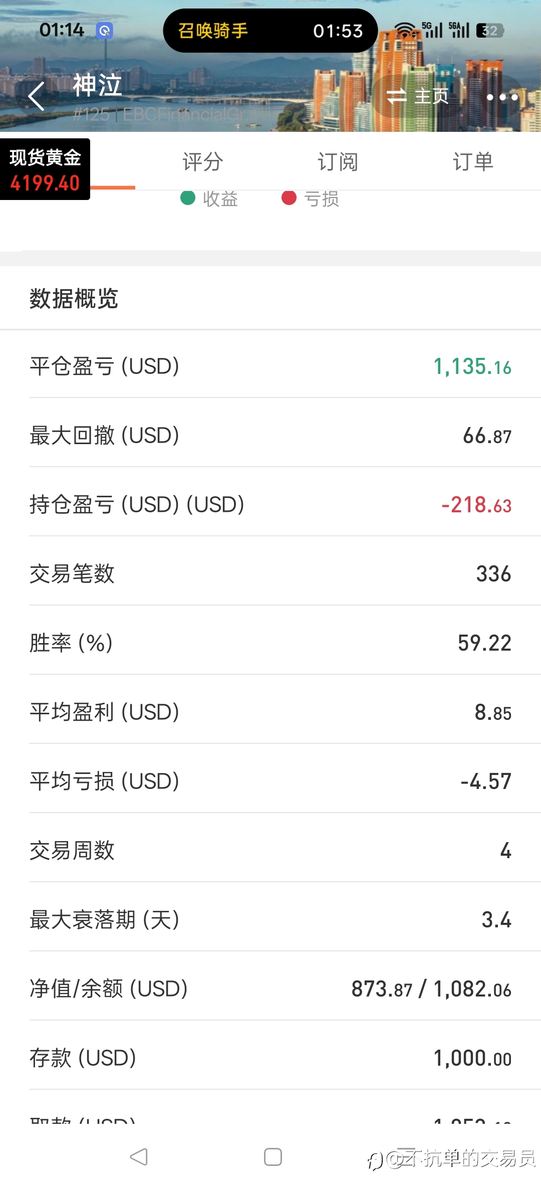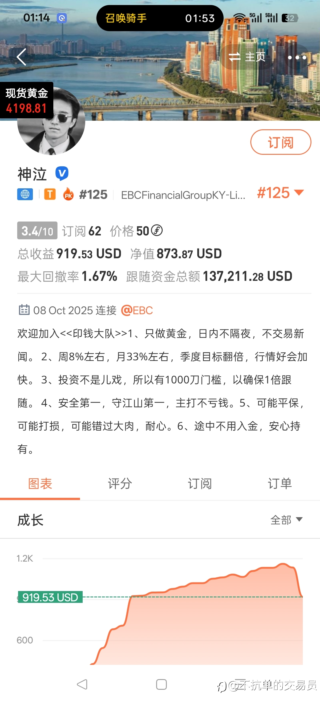 13号账号已出金,初始入金2000刀(切换过一次账户),2周时间,利润3445刀,交易量大概500标准手,返佣3000刀,合计收益6445刀多,收益率450%,因短进短出,延迟高 仓位重,导致本账号赚钱,跟单亏钱,故不再开放跟单。
