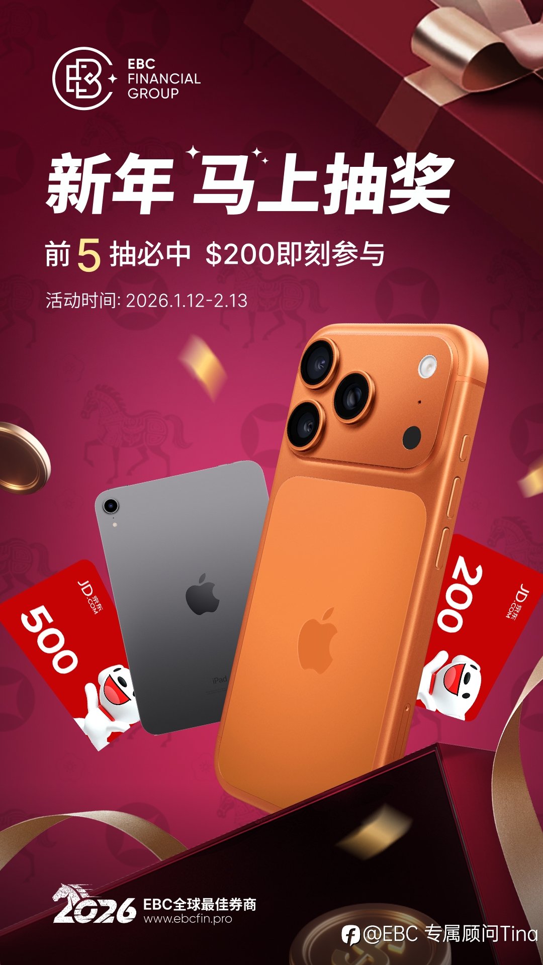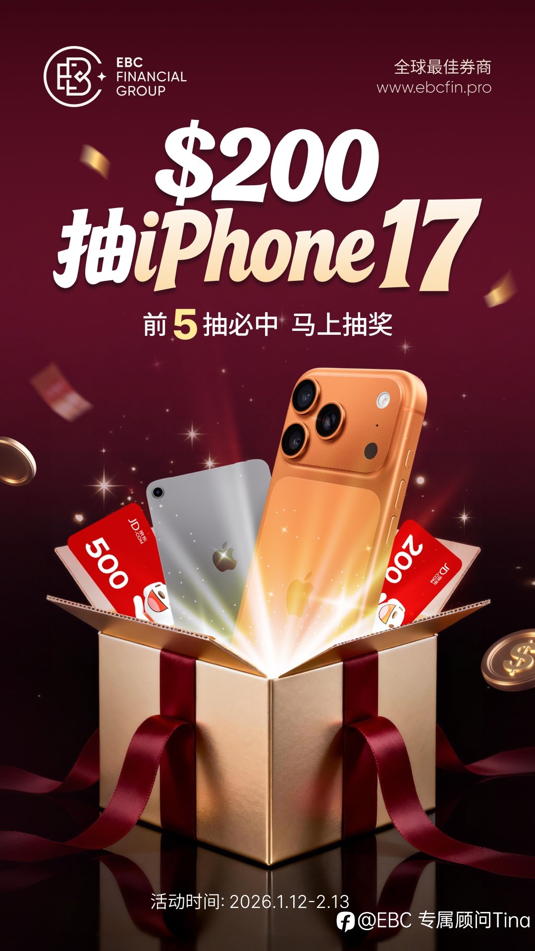 EBC新年礼遇·入金抽iPone17 活动时间:1.12-2.13 活动规则: 活动期间,累计有效净入金每满 200美金 自动获得 1张奖券,上限20张 奖券等级会随着活动期间用户有效交易量(平仓手数)的增加而升级,且升级后不会降级。