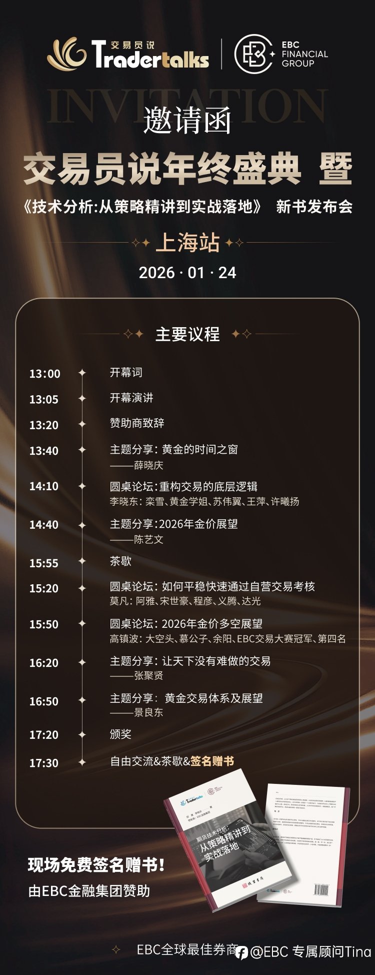 2026年伊始,一场专为交易者与市场洞察者准备的思想盛宴即将开启。我们诚挚邀请您拨冗出席 “EBC携手交易员说举办年终盛典”暨《技术分析:从策略精讲到实战落地》新书发布会(上海站)。 这不仅是一场新书首发会,...
