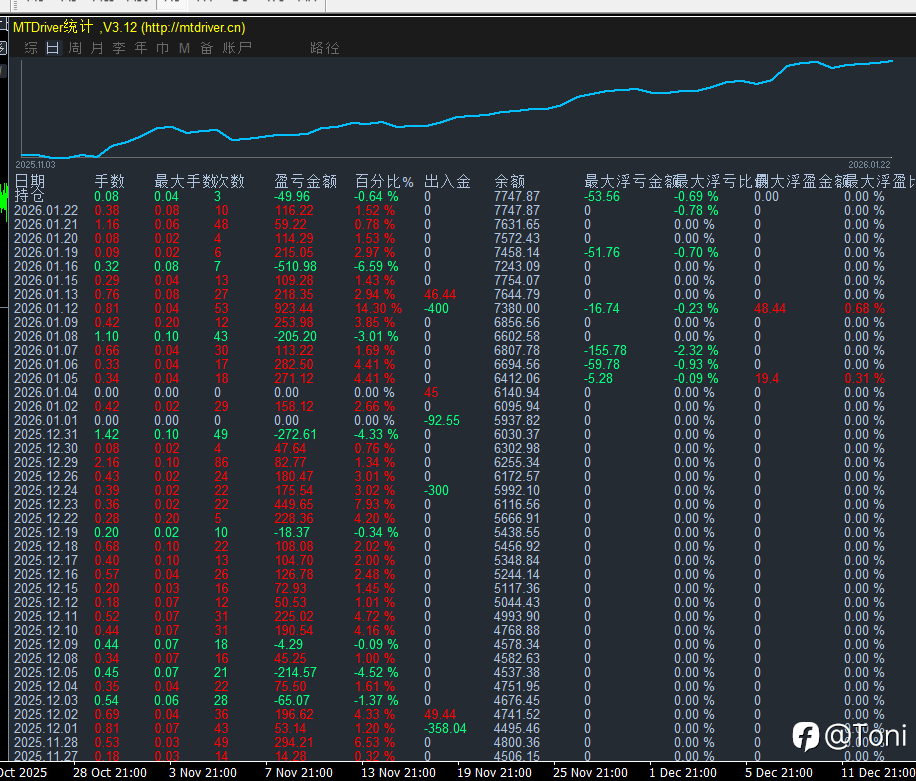 阶段记录|给孩子生活费账户 继续以给孩子做生活费的账户为标: 对应 FM 8# 信号,通过 TMGM 内部跟单,资金比例 1:1。 #账户日记 #阶段记录 #生活费账户 这是一篇阶段性的核对记录。 这段时间, 账户的运行逻辑没有改变, 用途也没有发生偏移, 依然围绕孩子的生活费需求展开。 账户资金有波动, 但节奏始终可控。 出金按计划发生, 钱在需要的时候, 能够顺利进入生活。 从执行层面看, 系统运行稳定, 没有因为短期行情 做出额外判断或干预。 更重要的是, 在这一阶段里, 交易本身没有占据过多注意力, 生活依然按自己的节奏推进。 阶段性回看, 账户在轨道上, 人也在轨道上。 记录到此。