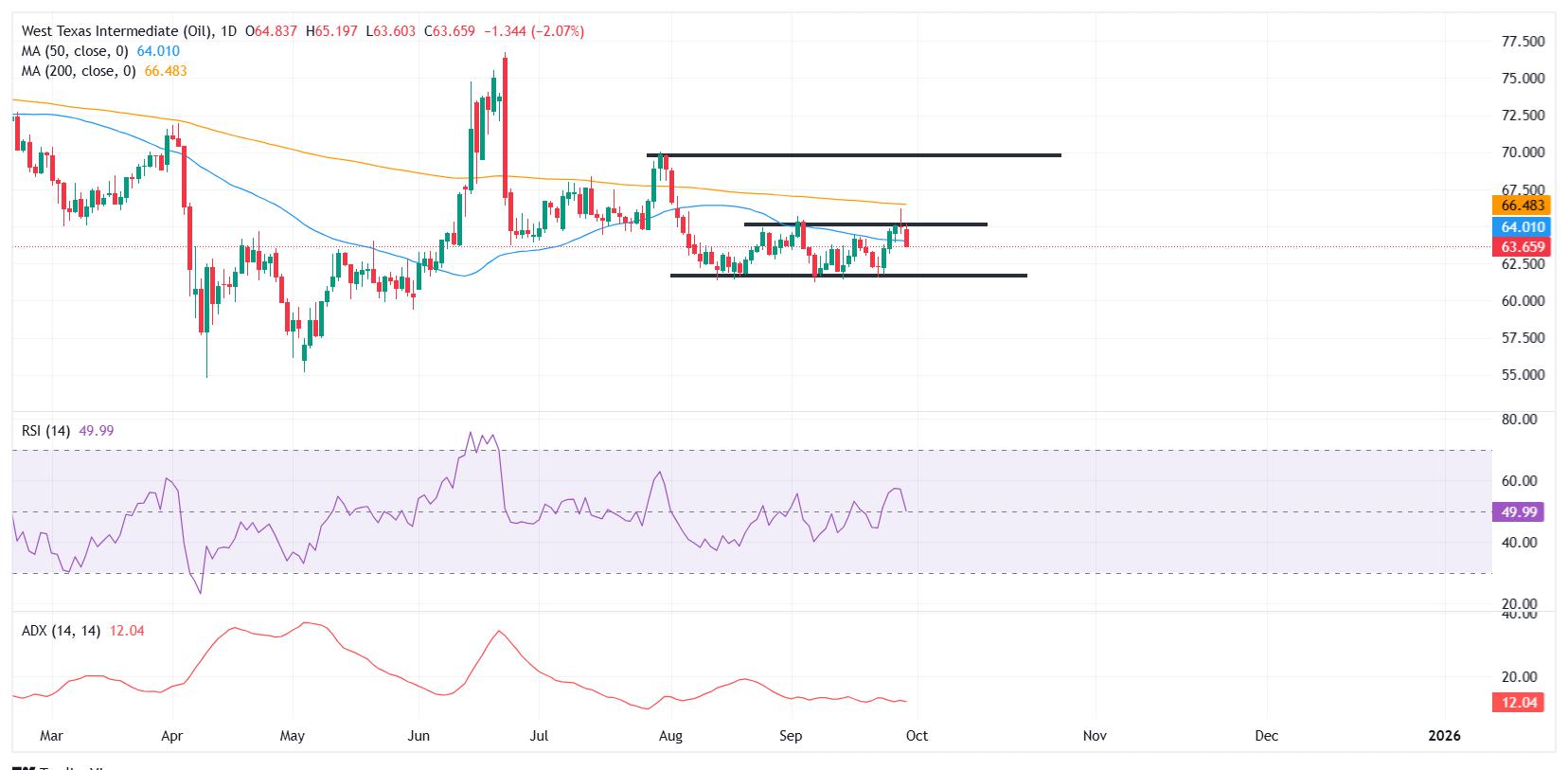 WTI extends its corrective slide on Monday, resuming its pullback after peaking at a seven-week high late last week.Price action remains trapped between $61.50-$65.00 range since mid-August, with the 50-day SMA acting as a key near-term pivot.A sustained recovery above $65.00 and last week’s $66.19