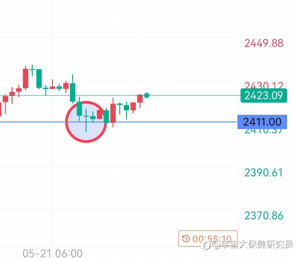 今天是5月21日,随手记录一下黄金的分析,技术分析只点1%,也尽力做好! 黄金周一加速突破历史新高2450,走低下跌至2407区域,反弹的力度也比较大到37阻力点。 从上图H4看,昨天反弹k线为pinbar线,在上涨行情,均线上,偏向看涨。 21日,今日周二早盘,价格压制2433再度下跌至2406破低点,反弹上涨未得到确认。 时间来到11点左右,出现了反弹 以2406-2404作为防守位置,在2411进场买入,是不错的选择。 以欢豆来验证了以上观点: 今天还是犯错了手里的2.4刀,早早在10点半前进场,没有在确认反转信号