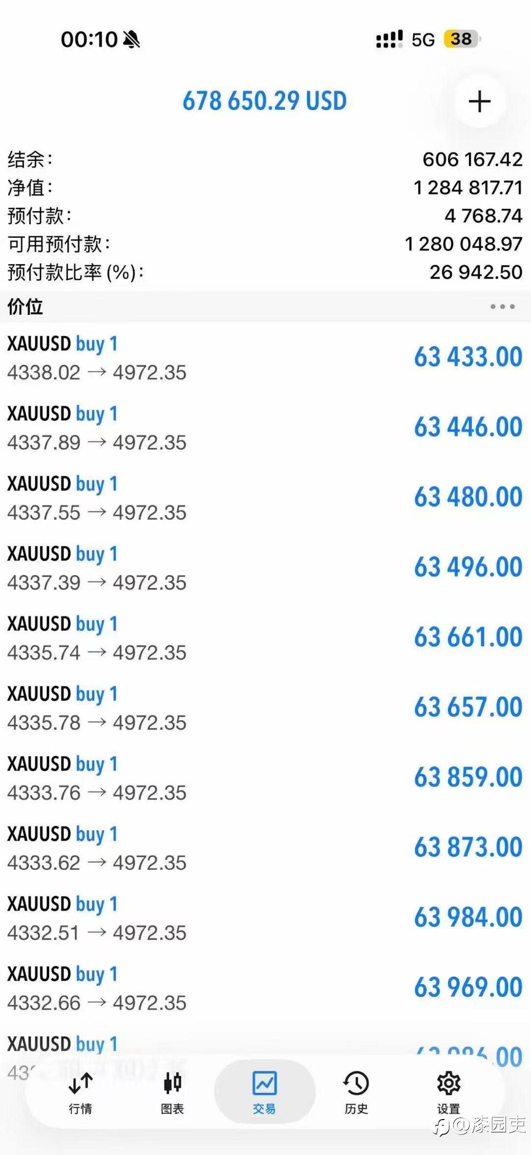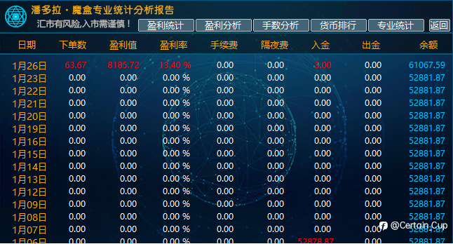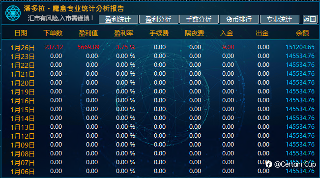 1月26日 收益图 账户1:收益8186,占比13.4%(手动+EA) 账户2:收益5670,占比3.8%(手动+EA) 近日黄金波幅增大,大家都注意风险。