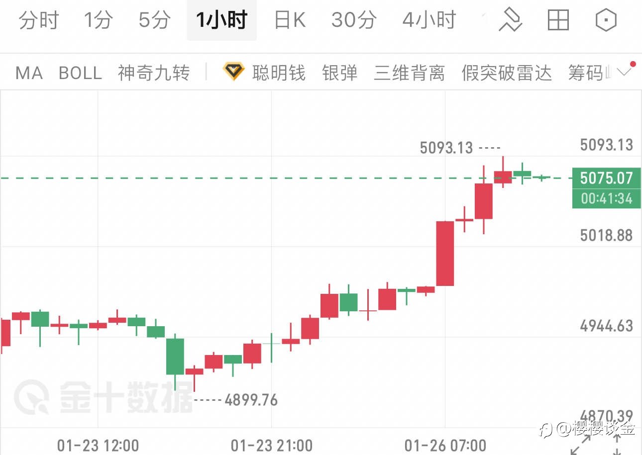 樱樱:黄金早间破高,午后策略不变 今日早间开盘,黄金承接上周上涨动能,开盘价直接站上5018美元。随后多头力量快速释放,在1小时K线图上连续拉出实体大阳线,仅用不到4小时就突破了5093的前期高点。截至目前,价格短暂回落后企稳于5075美元附近,从K线形态看,多头趋势延续性极强,回调力度相对有限。 今日市场消息面集中释放利好:一方面,美国公布的初请失业金人数意外增加,强化了市场对美联储3月降息的预期,美元指数走弱直接提振黄金买盘;另一方面,红海局势持续紧张叠加中东地缘冲突的避险需求,推动资金持续流入贵金属市场。 技术面上,
