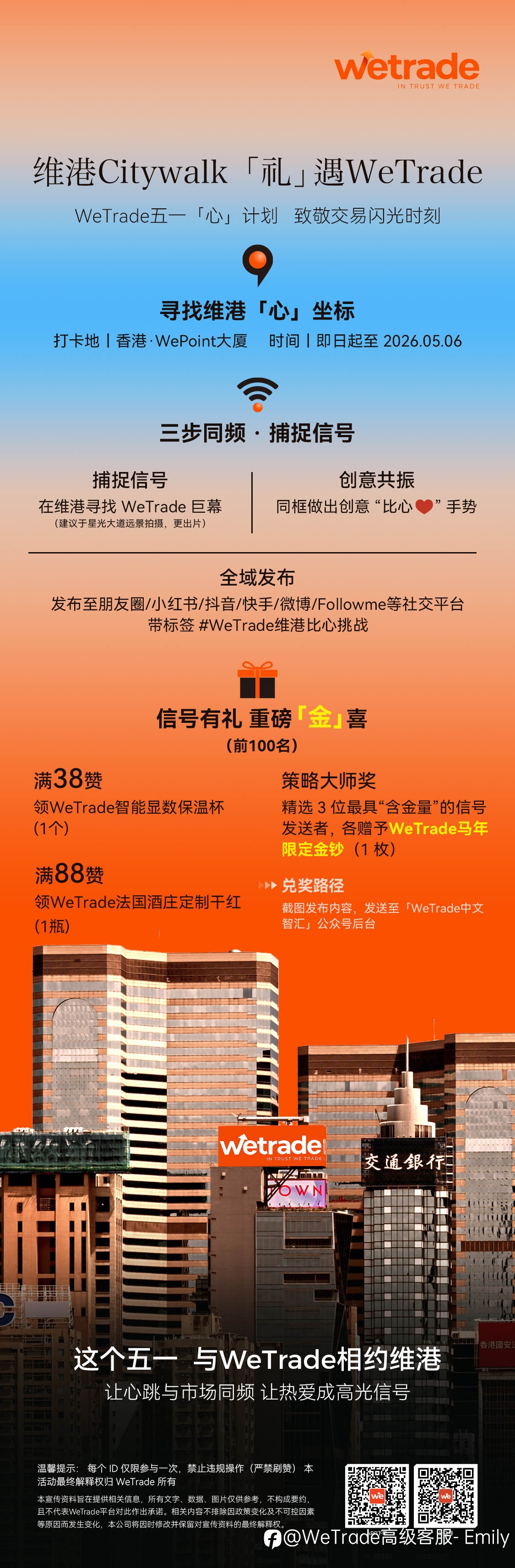 这个五一,在维港来一场不一样的「心」动打卡💙 和 WeTrade 一起Citywalk,用镜头捕捉属于您的心动信号📍找到WeTrade广告大屏,比心打卡,发布至社交平台✨ 🧡邀请好友点赞最高送WeTrade法国酒庄定制干红 🏆...