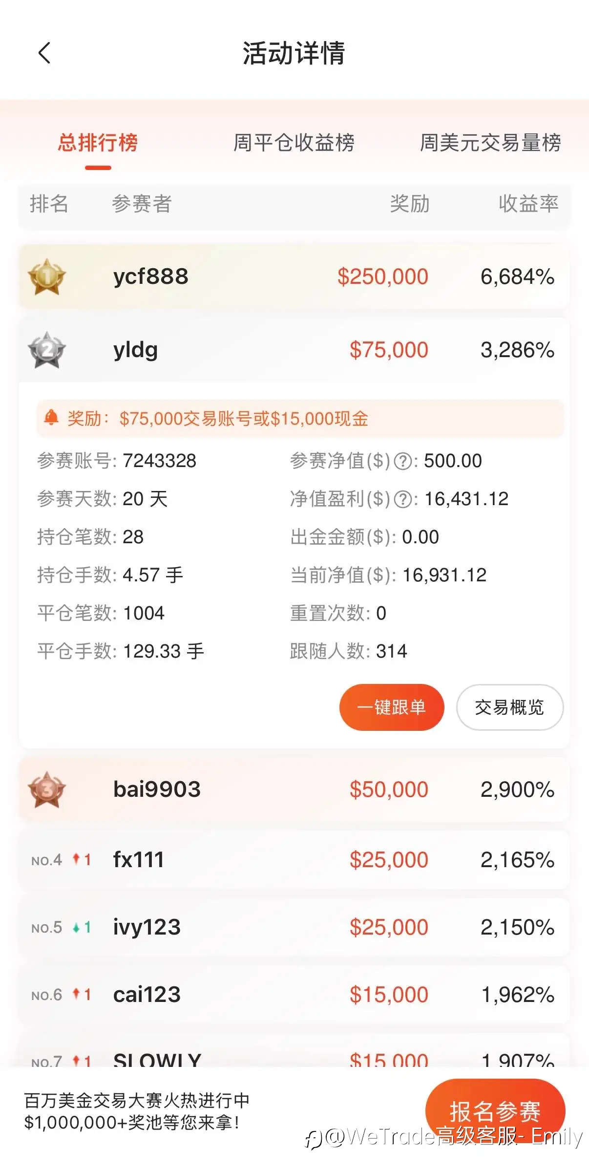 🔥战火已点燃,榜单持续刷新! WeTrade 百万美金交易大赛第一赛季 第二周排行榜出炉,高手对决已进入白热化阶段! 💰 $1,000,000+ 奖池加持 📈 周周冲榜,周周有奖 🚀 一键跟单,复制冠军策略 现在,就是逆...