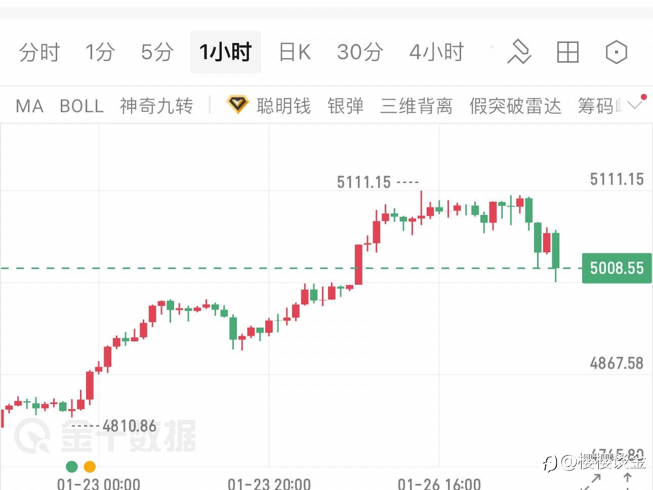 Jia格正好在4967附近二次承ya,不过承ya的结论也是jia格下来后才能得出来,但不管如何,今天还是属于刷gao的走shi,前面没有折腾,今天也是一样,这个行情突然的一bo下za不奇怪,冷不防的突然la起也正常,属于猜硬币...