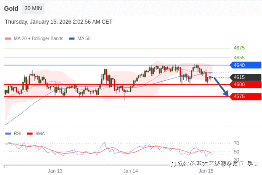 1月15日交易策略: 日内: 调整。 交易策略 在 4640 之下,看跌,目标价位为 4600 ,然后为 4575 。 备选策略 在 4640 上,看涨,目标价位定在 4655 ,然后为 4675。 技术点评 RSI技术指标看跌,有进一步向下趋势。