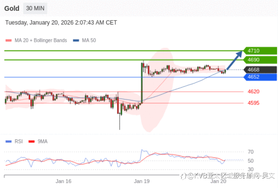 1月20日交易策略: 日内: 超短线(当日内)支撑位在4652附近。 交易策略 在 4652 之上,看涨,目标价位为 4690 ,然后为 4710 。 备选策略 在 4652 下,看空,目标价位定在 4620 ,然后为 4595。 技术点评 RSI技术指标...
