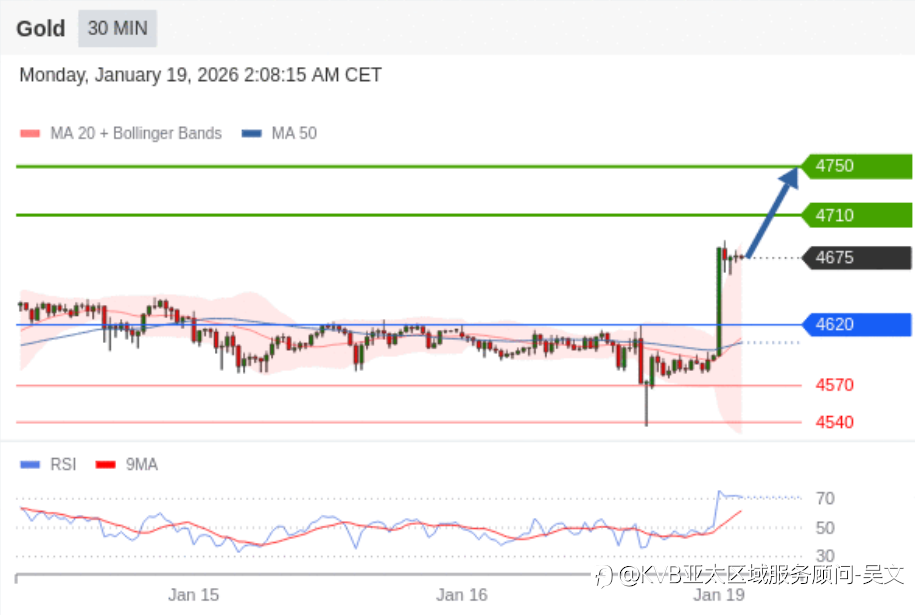 1月19日交易策略: 日内: 目标位为4750。 交易策略 在 4620 之上,看涨,目标价位为 4710 ,然后为 4750 。 备选策略 在 4620 下,看空,目标价位定在 4570 ,然后为 4540。 技术点评 RSI技术指标向上运行。