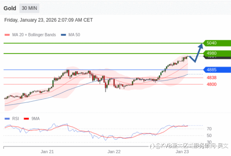 1月23日交易策略: 日内: 朝5040运行。 交易策略 在 4885 之上,看涨,目标价位为 4980 ,然后为 5040 。 备选策略 在 4885 下,看空,目标价位定在 4838 ,然后为 4800。 技术点评