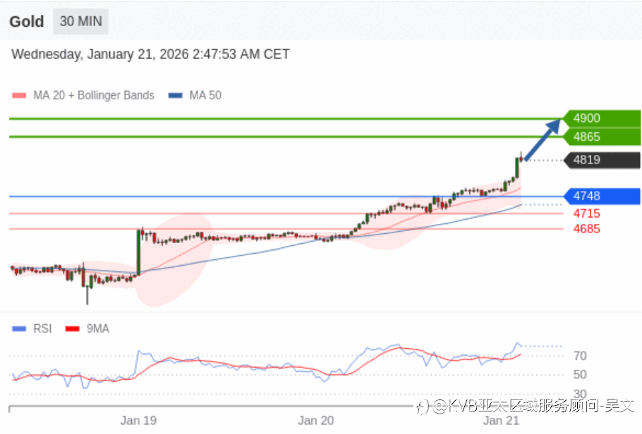 1月21日交易策略: 日内: 目标为4900。 交易策略 在 4748 之上,看涨,目标价位为 4865 ,然后为 4900 。 备选策略 在 4748 下,看空,目标价位定在 4715 ,然后为 4685。 技术点评 RSI技术指标呈现继续上升趋势。